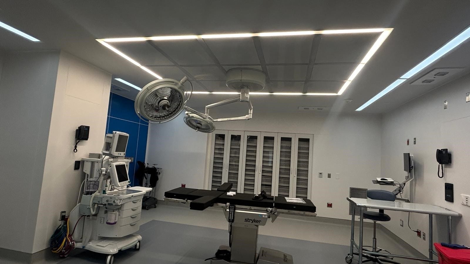 To meet surgical lighting needs, powerful LED lights (tunable and dimmable) can be built into each diffuser, eliminating the need for traditional hanging lights, freeing up additional ceiling space for other equipment.